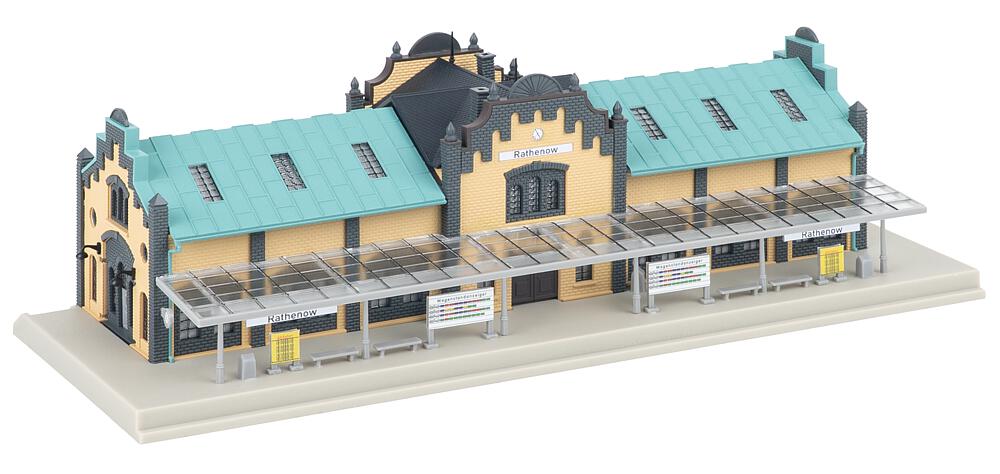 Dieses Modell fängt den Charme der Jahrhundertwende ein: hell-türkises Dach, helle gelbe Steinfassade und eine verglaste Bahnsteigüberdachung auf der Bahnseite verleihen dem Bahnhof Charakter. Die klare Klinkerbauweise und liebevolle Details machen ihn zu einem stimmungsvollen Mittelpunkt jeder Anlage. Das Modell ist architektonisch eigenständig und hat keinen Bezug zum Originalbahnhof in Rathenow (Brandenburg).