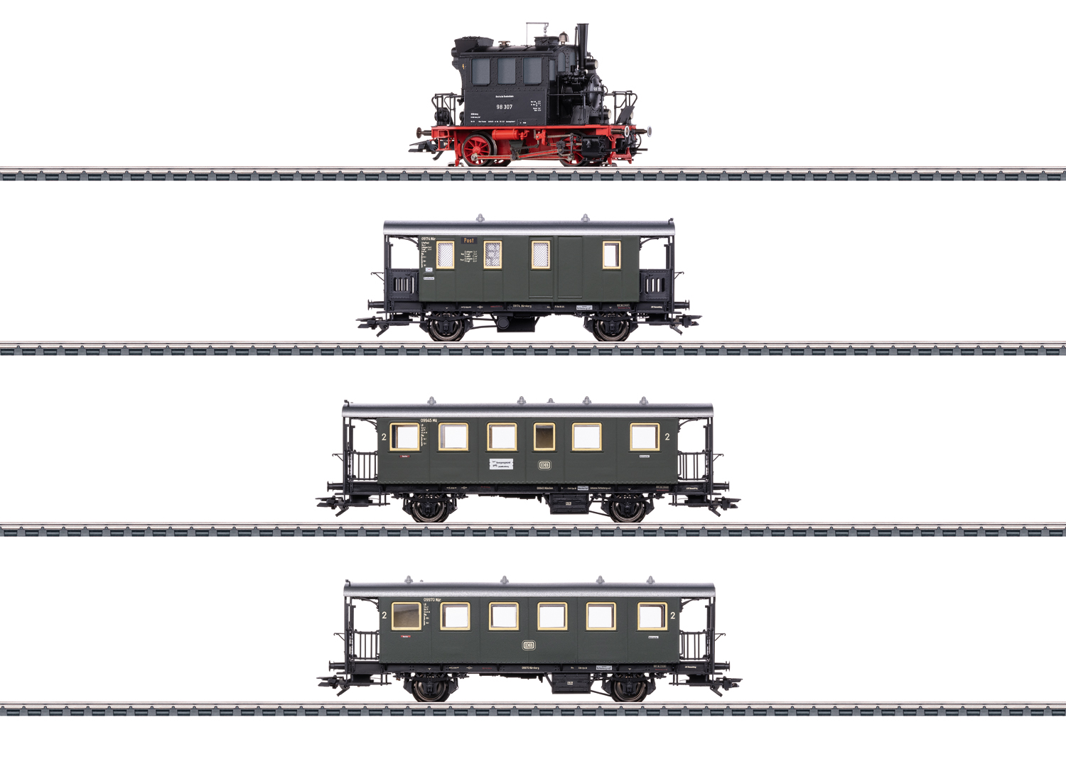 Modell: Lokomotive mit Digital-Decoder mfx+ und umfangreichen Geräuschfunktionen. Miniaturmotor im Kessel. 2 Achsen angetrieben. Haftreifen. Fahrtrichtungsabhängig wechselndes Dreilicht-Spitzensignal konventionell in Betrieb, digital schaltbar. Mit Pufferspeicher. Trennbare, stromführende Kupplung digital schaltbar. Innenkessel aus Metall. Gehäuse aus metallgefülltem Kunststoff für verbessertes Zugkraftverhalten. Zahlreiche angesetzte Handläufe und Griffstangen. Filigrane Nachbildung der Kesselarmaturen und weiterer Details. Länge über Puffer ca. 8,0 cm. Beide Personenwagen und der Postwagen mit serienmäßig eingebauter LED-Innenbeleuchtung mit Pufferspeicher und trennbaren, stromführenden Kupplungen. Stromversorgung der Wagen über die Lok. Gesamtlänge über Puffer ca. 50 cm.