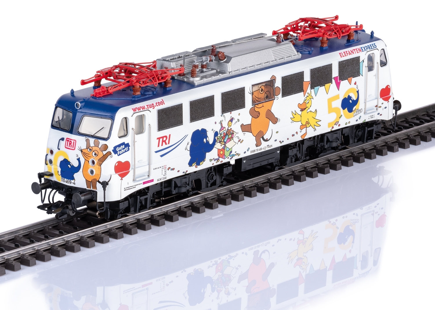 Vorbild: Elektrolokomotive Baureihe 110 der Train Rental GmbH (TRI). Lokkasten mit aerodynamischer Front, der sogenannten Bügelfalte, mit rechteckigen Klatte-Lüftergittern und Maschinenraumfenstern. Betriebsnummer 110 469-4. Betriebszustand ab Januar 2025 in auffälliger Gestaltung als "Elefantenexpress".