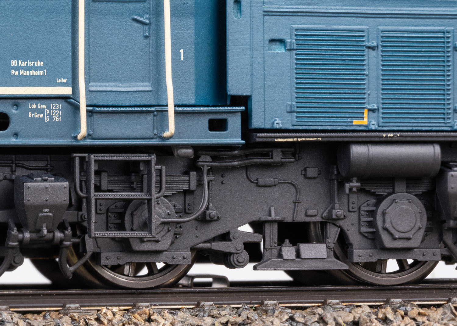 Modell: Mit Digital-Decoder mfx+ und umfangreichen Geräuschfunktionen. Geregelter Hochleistungsantrieb mit Schwungmasse, zentral eingebaut. Antrieb auf jeweils zwei Achsen je Treibgestell. Haftreifen. Fahrtrichtungsabhängig wechselndes Dreilicht-Spitzensignal und zwei rote Schlusslichter konventionell in Betrieb, digital schaltbar. Spitzensignal an Lokseite 2 und 1 jeweils digital separat abschaltbar. Wenn Spitzensignal an beiden Lokseiten abgeschaltet ist, dann beidseitige Funktion des Doppel-A-Lichtes. Führerstandbeleuchtung jeweils separat digital schaltbar. Zusätzlich kann eine Anfahrlampe fahrtrichtungsabhängig digital geschaltet werden. Beleuchtung mit wartungsfreien warmweißen und roten Leuchtdioden (LED). Mit Pufferspeicher. Angesetzte Griffstangen. Führerstände und Maschinenraum mit Relief-Inneneinrichtung. Lokführerfigur im Führerstand 1 sitzend. Leicht gealterter Betriebszustand. Ansteckbare Bremsschläuche und Schraubenkupplungsimitationen liegen separat bei. Außerdem liegt eine Postkarte mit Abbildung der Lok bei. Länge über Puffer 21,4 cm.