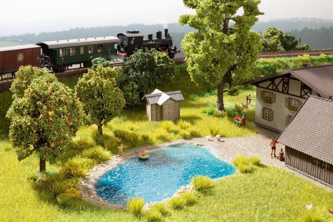 Wassergestaltung – jetzt NOCH einfacher und realistischer! Gewässerfarben-Set Der Artikel "Gewässerfarben-Set" ist ein Set mit fünf gebrauchsfertigen Farben, die speziell zur Gestaltung von Gewässern in Modelllandschaften gedacht sind. Jede Flasche enthält 30 ml Farbe in den Tönen Dunkelblau, Ultramarin, Türkis, Schlamm_Braun und Weiß. Die Farben lassen sich exakt dosieren dank feiner Tropfaufsätze. Sie haften auf Holz, Karton, Gips, NOCH_Hart-schaum und trocknen matt und hitzebeständig. Dadurch lassen sie sich mit anderen NOCH-Produkten wie dem Artificial Water oder den Water_Drops kombinieren, um realistische Wasseroberflächen zu erzeugen. In der Anwendung empfiehlt es sich, die Mittelseite eines Gewässers dunkler zu gestalten und zum Rand hin heller zu verblenden. Anschließend kann man eine dünne 2–3 mm Schicht transparenter Wasserresin auftragen und eventuell mit Oberflächeneffekten ergänzen. Da das Set maßstabsneutral ist, kann es in Anlagen jeder Spurweite eingesetzt werden – H0, TT, N, Z, G etc.