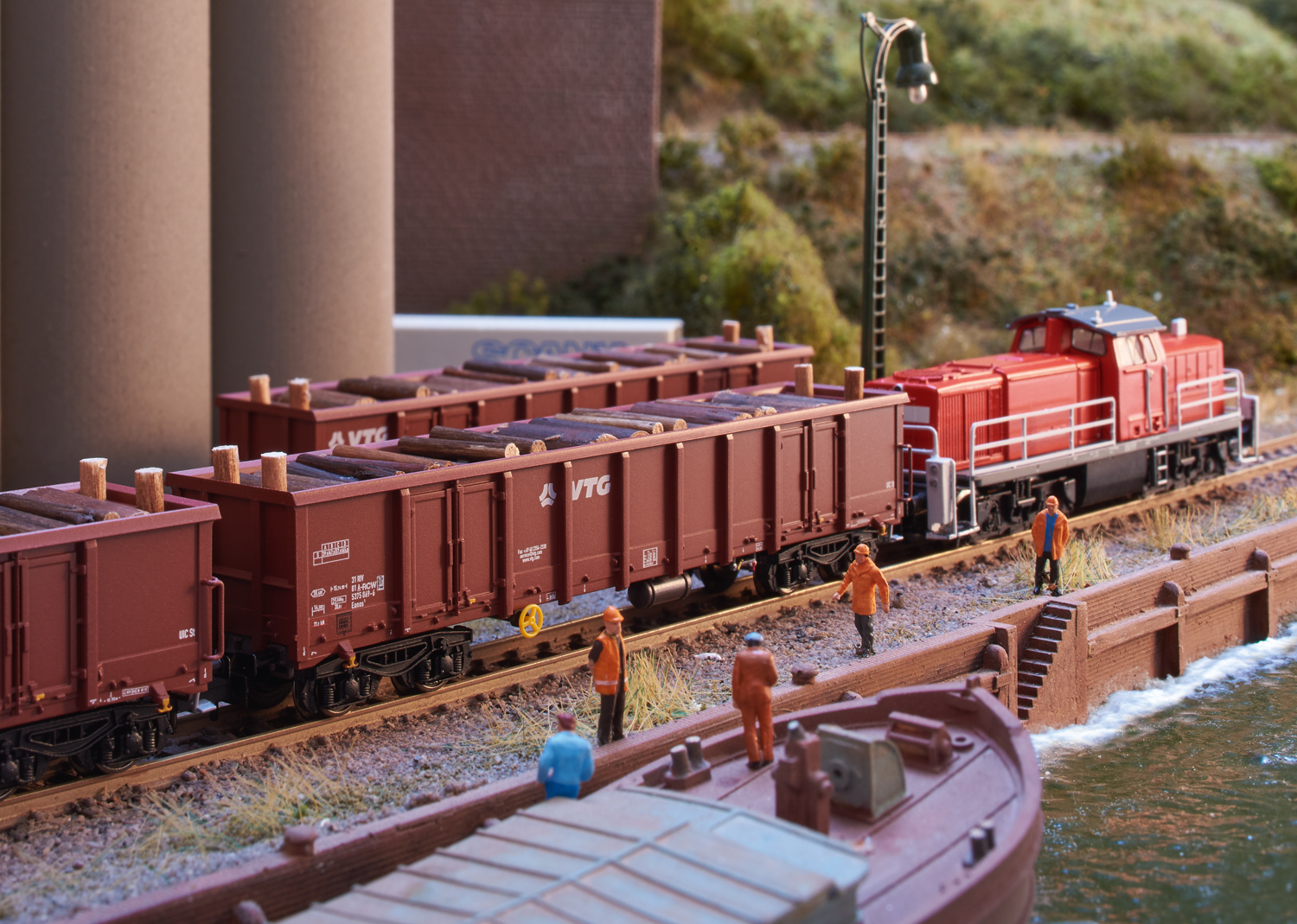 Modell: Mit Kinematik für Kurzkupplung. Mit Ladegut Stammholz. Gesamtlänge über Puffer 294 mm.