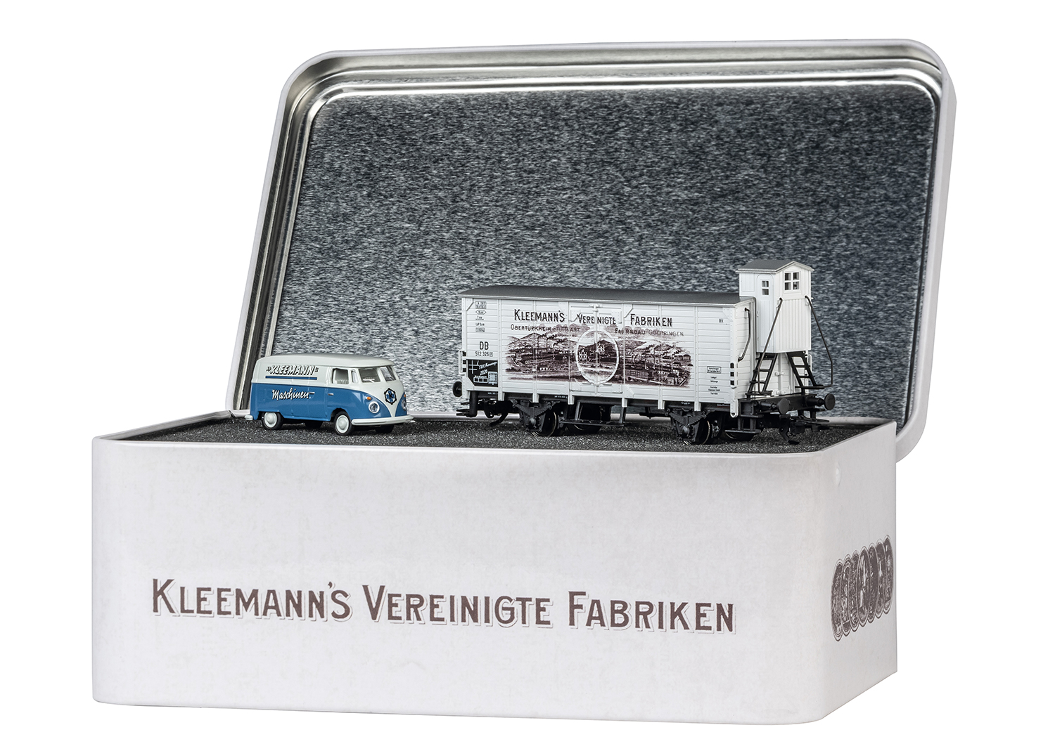 Modell: Mit separat angesetztem, hochgestellten Bremserhaus. Separat angesetzte Griffstangen und längslaufende Trittstufen. Länge über Puffer 11,0 cm. Gleichstromradsatz E700200. Ein Modell eines Volkswagen VW T1 Bulli von Schuco liegt bei. Attraktive Verpackung in einer Metall-Dose.